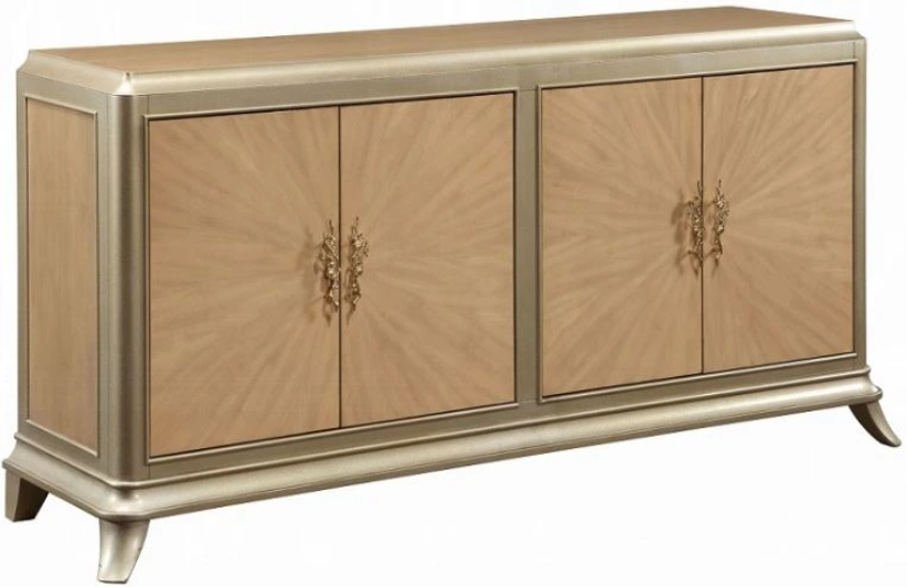 A two-tone oak finish sunburst effect brings exquisite personality to this Dodie console cabinet. Four large double cabinet doors offer plenty of space for storage in an entryway or living area. Behind each set of double doors, there is one adjustable shelf and a cable management cut-out.Read More