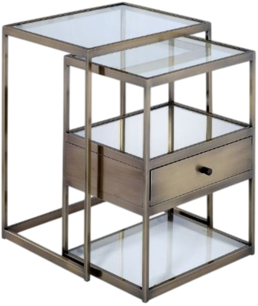 Create double the end table space with the contemporary Enca two-piece nesting tables. This trendy antique brass with clear glass set can be used next to each other in a stepped pattern to produce a beautiful showcase or used separately in different areas of the room.Read More