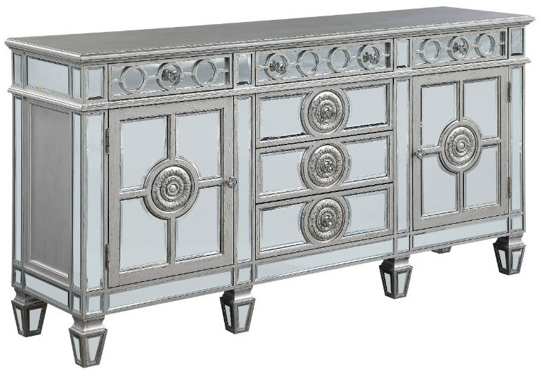 The Varian server exudes elegance with its antique platinum finish, wooden top, and beveled-mirror inlay accents. Featuring six spacious drawers with raised trim detailing, this piece combines style and practicality. Its reflective elements enhance the surrounding décor, making it a sophisticated addition to any dining or living space.Read More