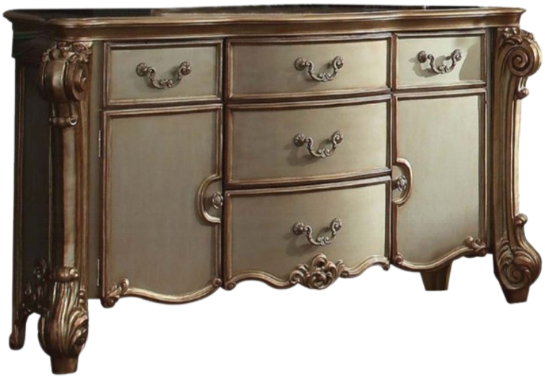 Create an elegant, traditional design in your bedroom with the gold patina bone Vendome dresser. This hand-crafted piece inspired from the luxurious deigns of the past, this five-drawer, two-door dresser features elaborate wood carving details, traditional hardware and a sophisticated style.Read More