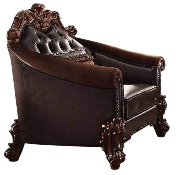 The Vendome II chair's two-toned brown faux leather and cherry upholstery is grand and classy with crystal like button tufting on the back in a crackled gold patina finish richly accented with gold leaf brushed onto each piece by hand.Read More