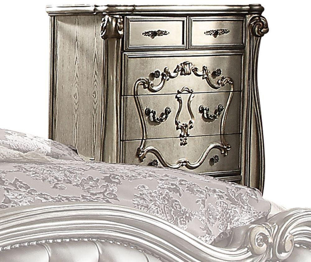The Versailles chest is the perfect accent to create the style of royalty your bedroom has been needing. This chest crafted in wood with cherry oak finish was inspired by old European design with brown copper metal hardware and intricate wood carvings on the front of the drawers.