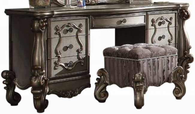 The Versailles vanity desk is the perfect accent to create the style of royalty your bedroom has been needing. Crafted in wood with an antique platinum finish was inspired by old European design with brown copper metal hardware and intricate wood carvings on the front of the seven drawers.Read More