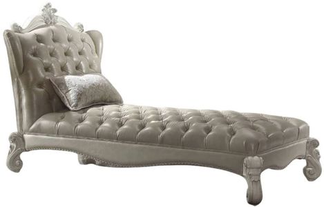 Create an elegant, traditional design in your room with the Versailles Chaise. A hand-crafted piece inspired from the luxurious designs of the past, this stunning piece comes in a bone white finish and features a vintage gray PU button-tufted back and seat with gray accent pillow.Read More