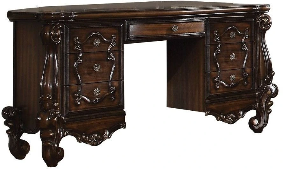 The Versailles vanity desk is the perfect accent to create the style of royalty your bedroom has been needing. Crafted in wood with cherry oak finish was inspired by old European design with brown copper metal hardware and intricate wood carvings on the front of the seven drawers.Read More