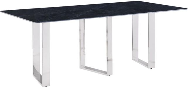 This rectangular dining table features a gray tabletop complemented by a silver base. It provides a sturdy surface with a clean, polished look, ideal for enhancing the dining experience in any space.Read More
