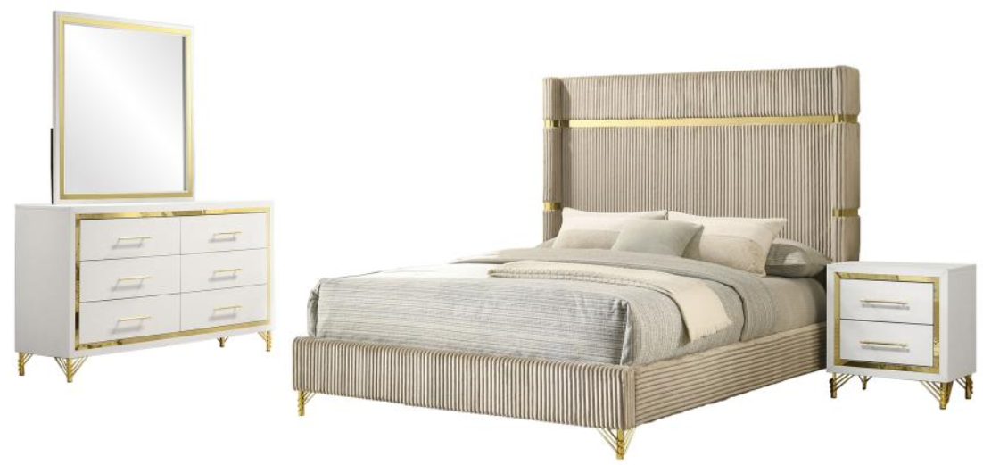 Effortlessly blending inviting softness and timeless sophistication, this four-piece modern bedroom set creates a rich but inviting ambiance. It centers on a stylish upholstered bed that pairs beige upholstery with a fluted look, creating impressive texture and dimensionality.Read More