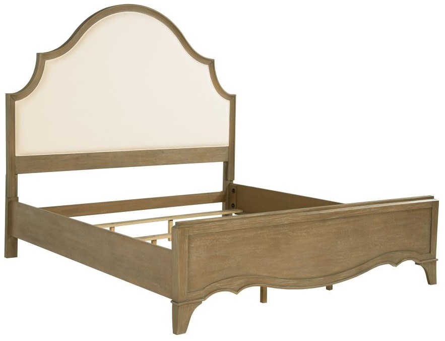 This French Provincial-inspired bed blends timeless elegance with modern craftsmanship. The arched headboard features an ecru fabric upholstered panel, framed by a gracefully curved solid poplar and engineered wood structure. A washed mango veneer finish enhances the natural grain, complementing the scalloped detailing on the footboard.Read More