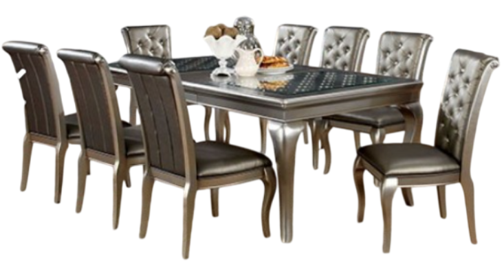 This seven‑piece dining set includes a rectangular glass‑top table and six cushioned chairs, offering seating for family and guests. The champagne‑finished legs add elegance, while the 18‑inch expandable leaf provides flexibility for intimate meals or larger gatherings, blending functionality with refined presentation.Read More