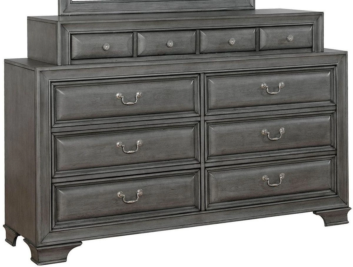 This bedroom dresser offers two solutions at once. It is visually stunning and has unrivaled storage space to keep your fabulous new room clutter free. With a total of ten drawers, this dresser can hold clothes, jewelry, and anything else necessary. The gray finish of this piece gives it a subtle elegance.Read More