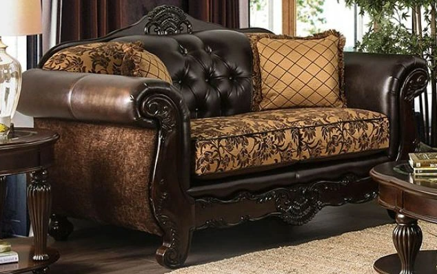 The seat features a distinct two-tone back with tufted leatherette breaking up the beautifully-patterned fabric. A contrasting welt spices up the otherwise standard, single seat cushion. An intricately carved wooden trim frames the rolling arms and a shaped crest plaque the skirt and backing emphasize the sophistication of this collection.Read More
