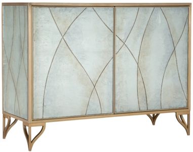 With a delicate organic look, the Joannie chest has silver leaf eglomise doors featuring a lacey etched pattern, accentuated by a gold frame and base and gray painted interior. The two doors have soft-close hinges and touch latches, with one adjustable shelf behind the pair of doors and a ventilated back panel.Read More