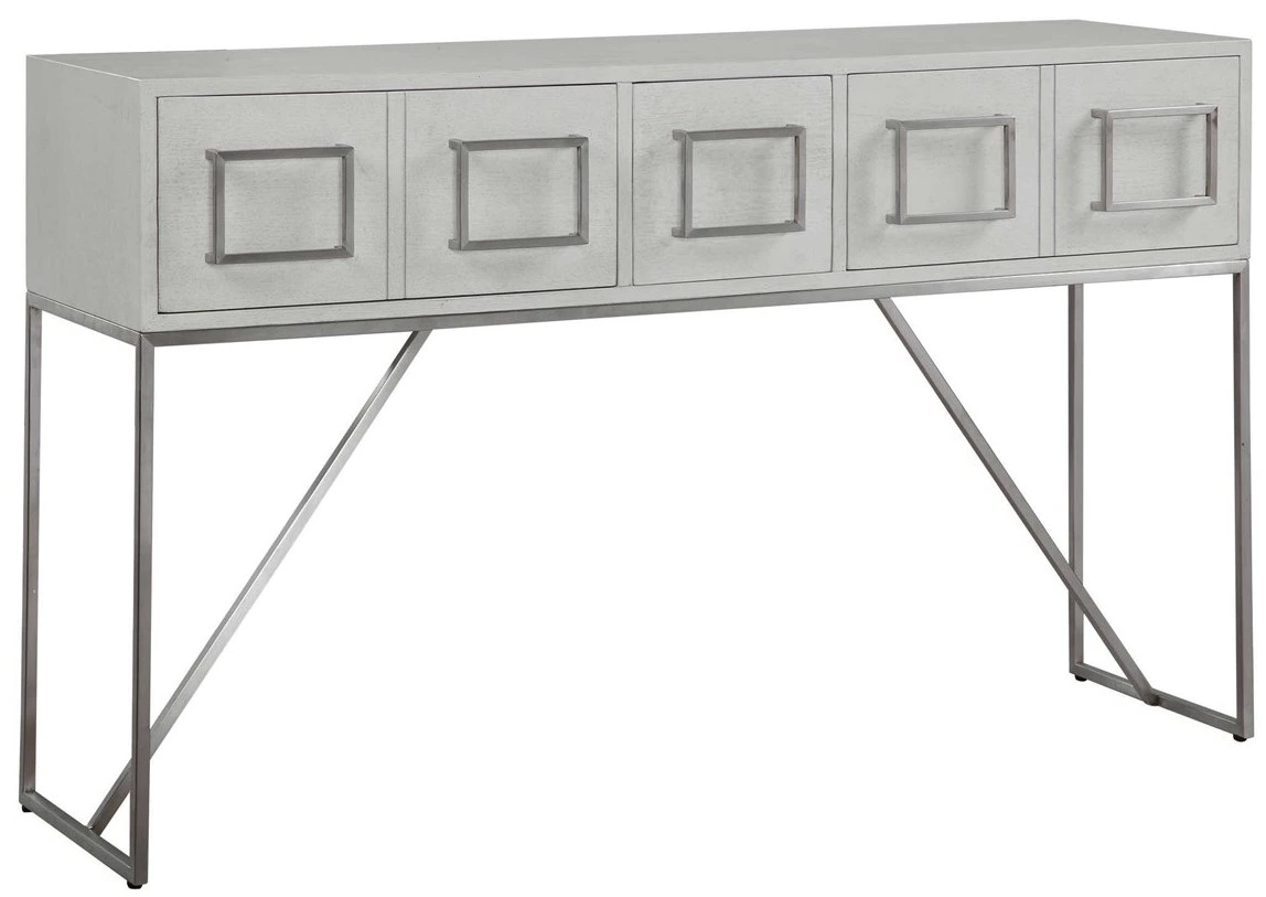 Clean contemporary styling, featuring oak veneer finished in a soft white with light gray distressing. Accented with statement hardware in brushed nickel stainless steel with a coordinating base. Has two double drawers and one single drawer in the center.