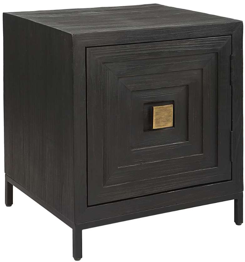 A contemporary geometric accent cabinet, constructed from deeply grained fir wood finished in a dark ebony stain and accented with brushed brass hardware. Has one fixed interior shelf. Make a bold statement by incorporating this stunning furniture into your home.Read More