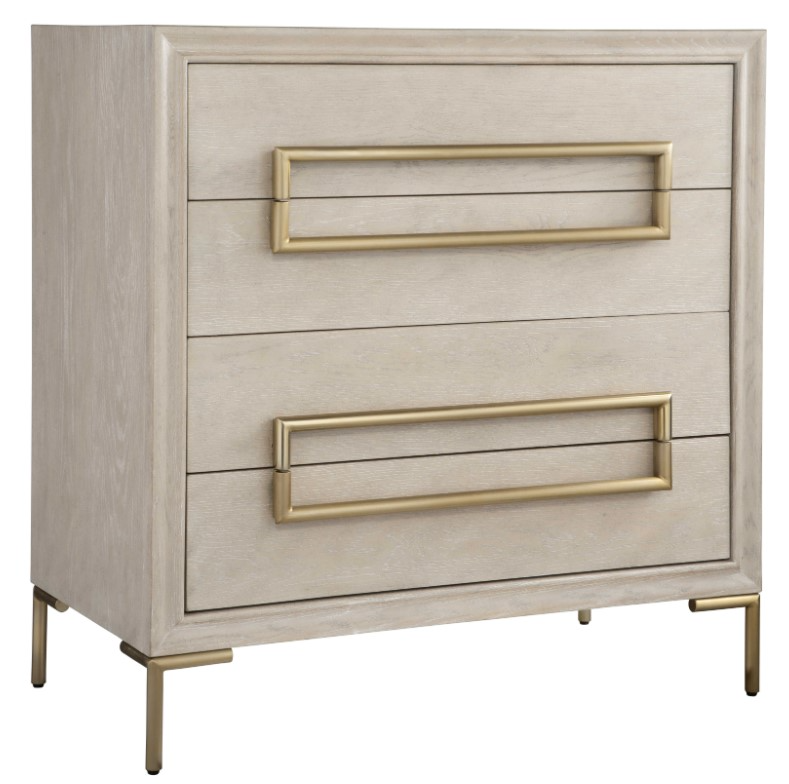 Showcasing a fresh contemporary look Alessia exhibits a light oak veneer adding a touch of brightness to any room. Its stylish appeal is elevated with the brushed brass plated stainless steel hardware and legs, with four soft closing drawers.Read More