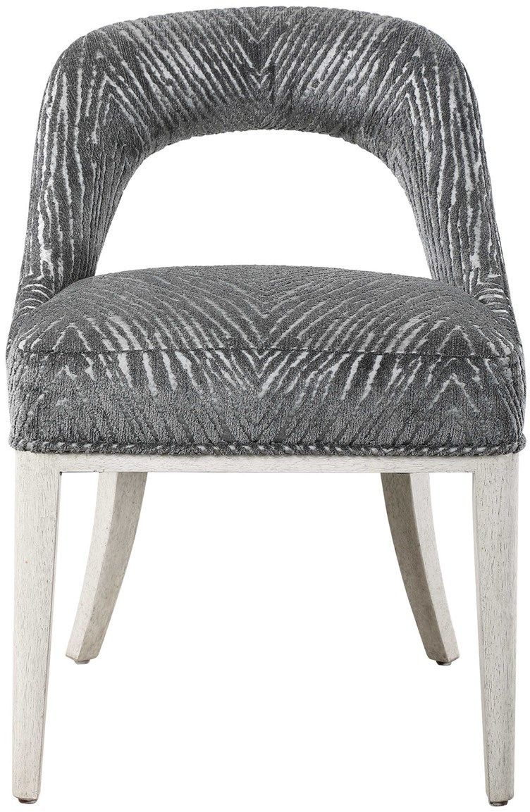 Perfect for dining, office, or vanity use, this open back accent chair features a charcoal and light gray animal print chenille with welt trim details over a solid wood frame in a lightly distressed off-white finish with light gray glazed distressing. Seat height is 20". Packed 2 per box but priced individually. Must be purchased in increments of 2.Read More