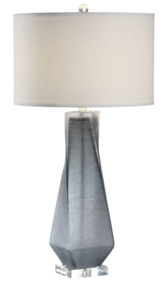 Unpolished, charcoal gray glass, featuring a subtle twist shape, accented with brushed nickel highlights and crystal details. The round hardback drum shade is a light beige linen fabric with natural slubbing and matching double trim.Read More