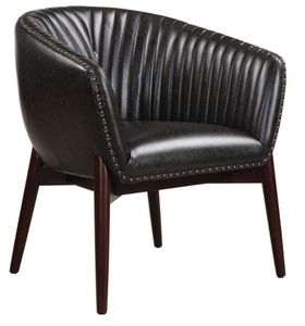 This high style design features a modernized take on Scandinavian style with "V" shaped channel-stitched faux leather, distressed in a casual onyx with contrasting antiqued brass nail head trim. The seat rests in a solid oak wood frame finished in a smooth walnut stain. Seat height is 19". Arm height is 26".