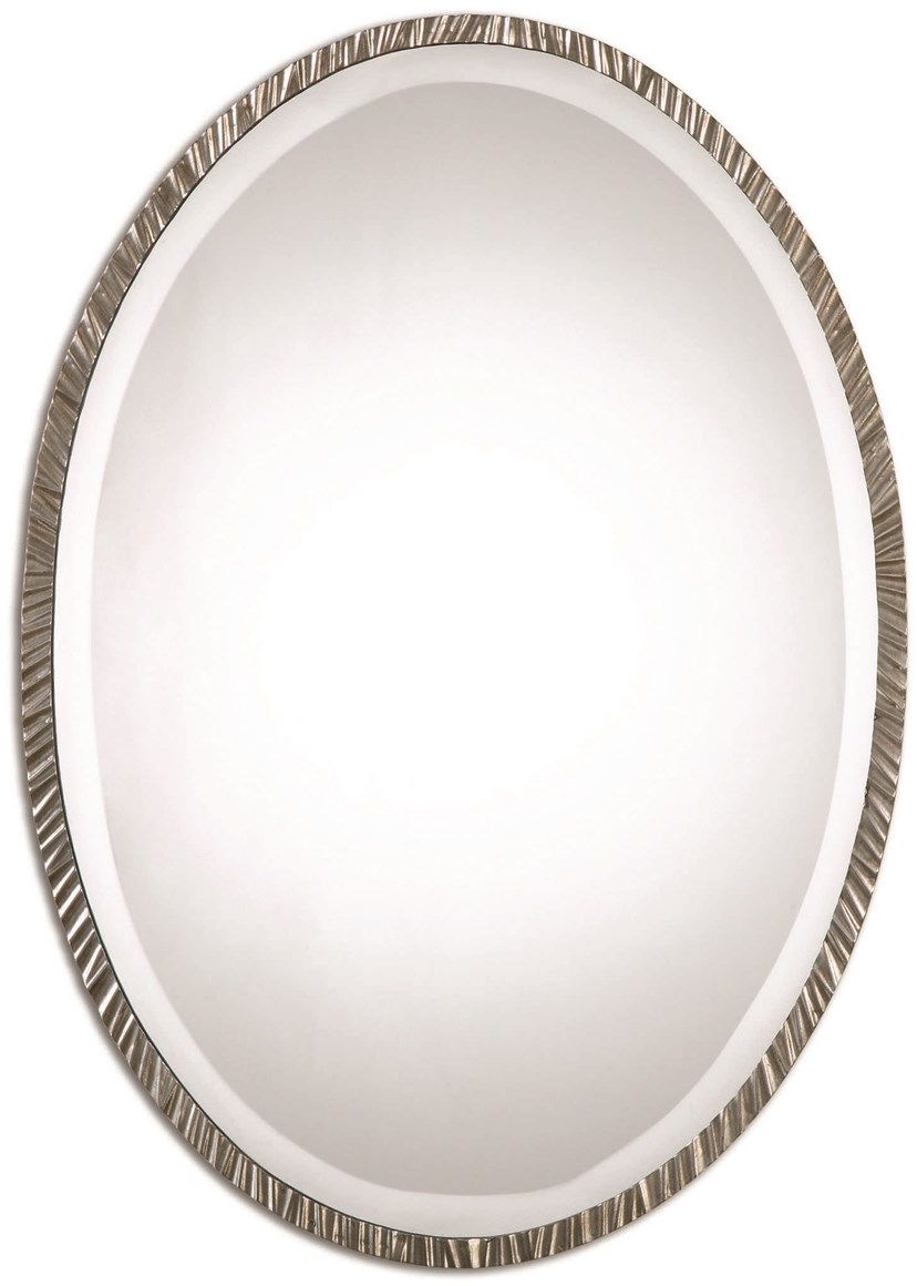 Textured metal frame finished in a plated polished nickel. Mirror has a generous 1 1/4" bevel.Read More