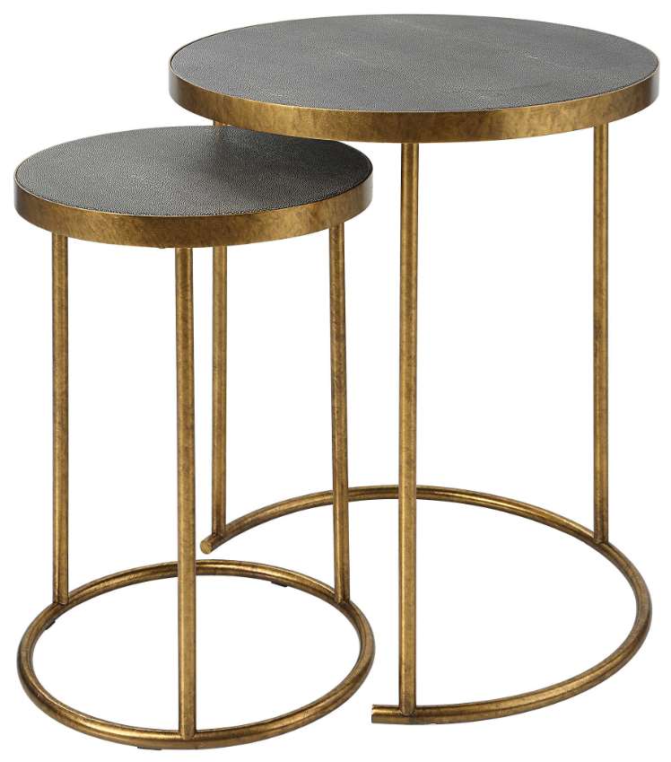 This set of two functional nesting tables is constructed with metal bases finished in antique burnished brass with faux gray shagreen wrapped tops. Make a bold statement by incorporating this stunning furniture into your home.Read More