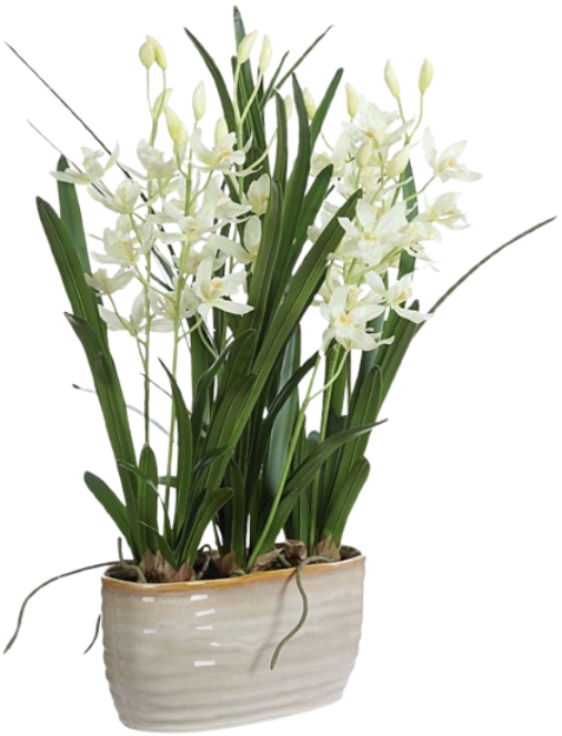 The Ariana Orchid Planter is a decorative faux plant arrangement designed to add a touch of elegance to home or office spaces. Sprays of cream cymbidium orchids with lush green foliage are nestled into a textured, tan glazed ceramic planter with faux soil.Read More