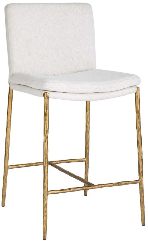 A gently padded and sloped seat features a plush attached cushion atop the hand forged chiseled iron base finished in aged gold. Upholstered in a textured white boucle with a toxin-free, eco friendly treatment to help resist water based stains.Read More