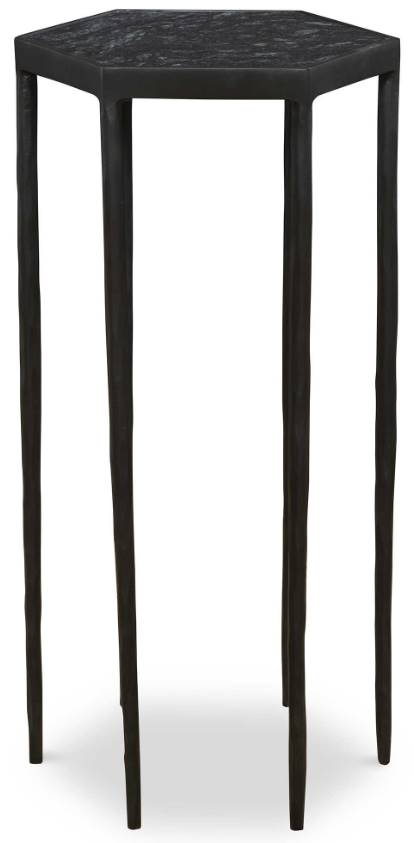 This striking hexagonal table features a chiseled iron base finished in satin black, paired with a honed black marble top with natural white veining. Because of the natural characteristics of marble, each piece will have unique veining patterns.Read More