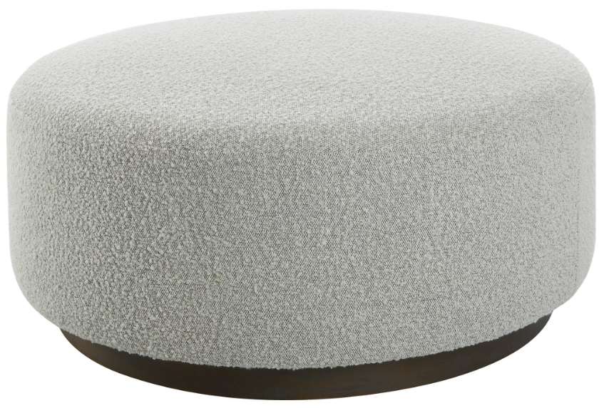 This plush ottoman is covered in a casual ivory and warm gray boucle fabric with a natural walnut stained wood base. Perfect as a coffee table topped with an oversized tray.Read More