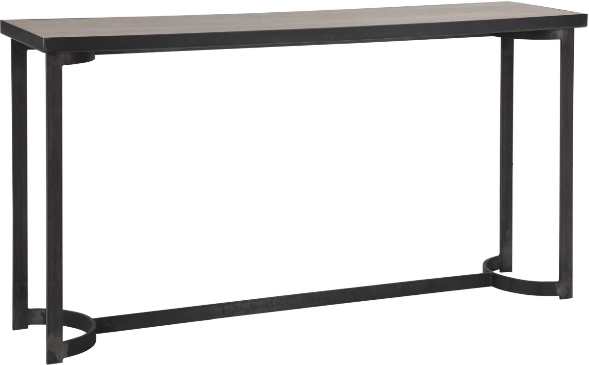 Evoking a modern lodge style, this clean lined console showcases a natural oak veneer top finished in a light gray, paired with a curved hand forged iron base in aged steel with natural burnishing.