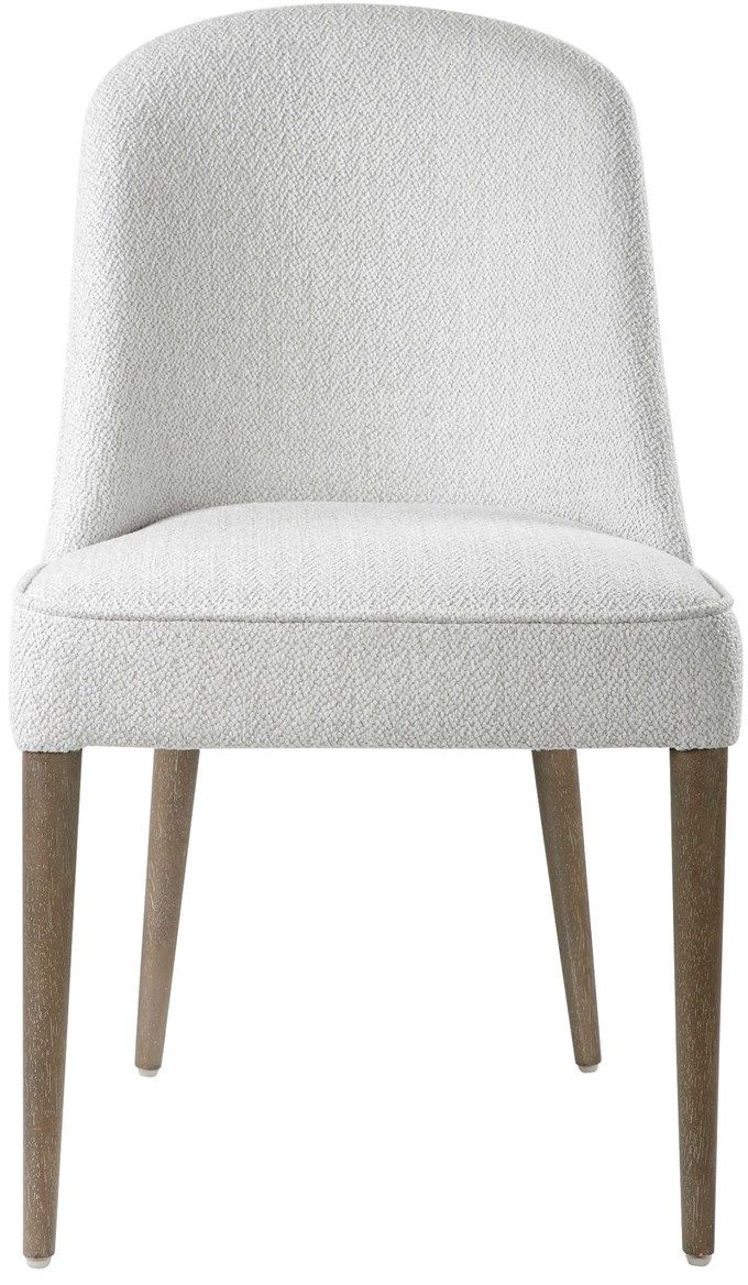 Perfect for modern dining, this armless chair features a casual off-white textured fabric with welted trim and solid wood legs finished in light walnut. Seat height is 19". Packed 2 per box but priced individually. Must be purchased in increments of 2.Read More