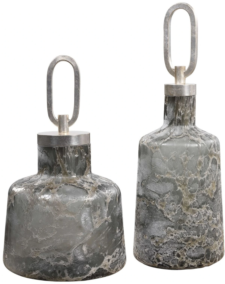 Crafted From Art Glass, These Bottles Showcase A Unique, Heavy Texture And Are Finished In Neutral Shades Of Charcoal, Taupe, And Silver. Each Is Accented By A Silver Leaf Finished Iron Top. Sizes: S-9x15x9, L-6x18x6
