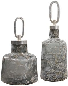 Crafted From Art Glass, These Bottles Showcase A Unique, Heavy Texture And Are Finished In Neutral Shades Of Charcoal, Taupe, And Silver. Each Is Accented By A Silver Leaf Finished Iron Top. Sizes: S-9x15x9, L-6x18x6Read More