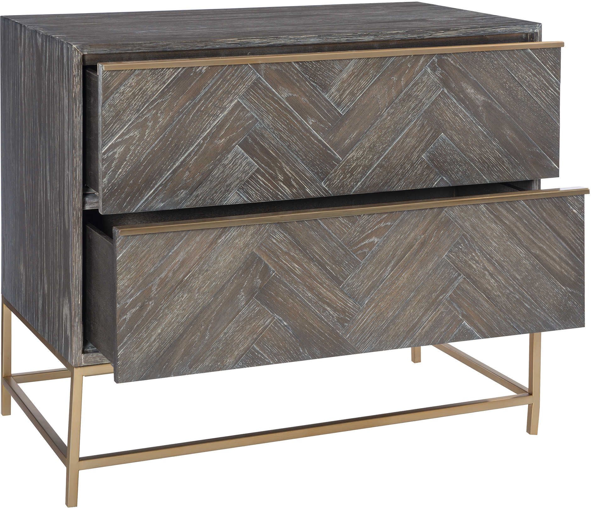 Showcasing understated style, this two drawer chest is layered in a dark walnut finished oak veneer accented with herringbone drawer fronts. Rests on a steel base in plated brushed brass with coordinating drawer pulls.