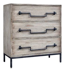 Constructed from plantation grown mango wood in an aged ivory finish with ember highlights, featuring old iron drop swing bar pulls, on an industrial iron base.Read More