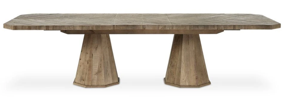 Made from solid reclaimed oak, this table features a beautifully crafted herringbone inlay on the tabletop, complemented by two striking geometric pedestal bases. The design seamlessly blends rustic charm with contemporary elegance. Solid wood will continue to move with temperature and humidity changes.Read More