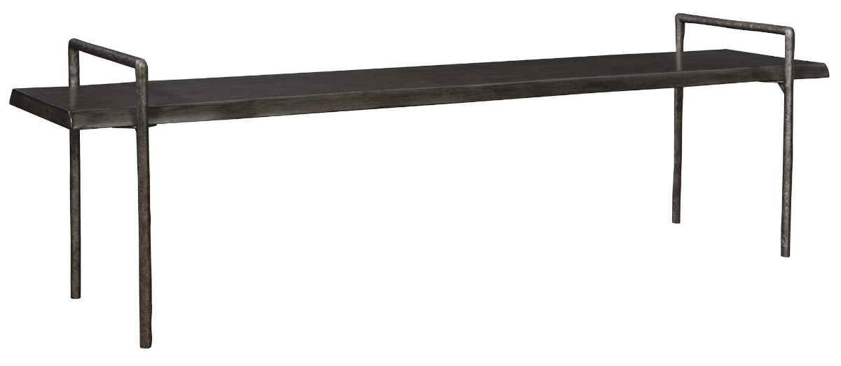 Modern lodge styling, featuring a solid acacia wood seat with a live edge look stained in a dark gray with an organically textured iron frame finished in tarnished silver.Read More