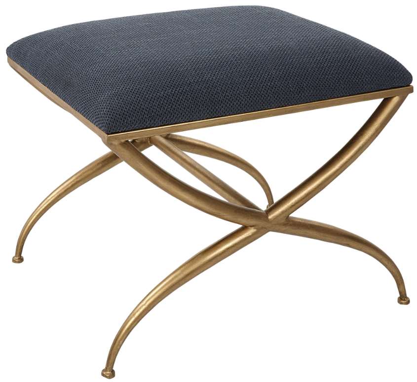Classic yet stylish, this small bench features a curved iron frame finished in an elegant gold leaf. The cushioned top is upholstered in a textured navy blue fabric, doubling as a comfortable seat or footrest.Read More