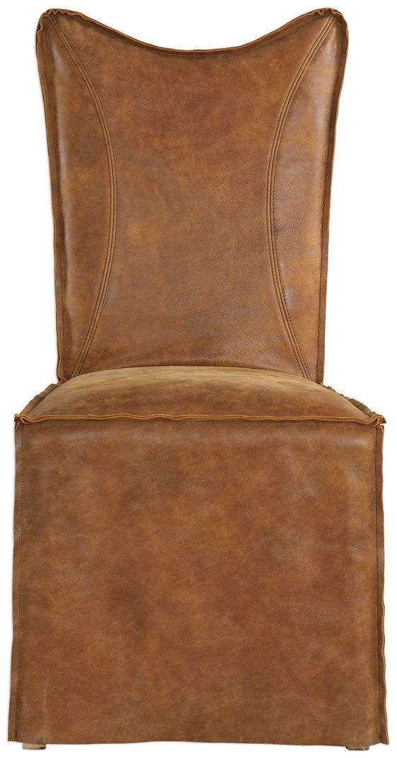 Thick top grain nubuck leather slipcover dining chair in a distressed hand sanded cognac with a tailored double stitched design and casual flange edges, featuring a button closure back. Because leather is a natural product, both texture and color will vary slightly from hide to hide and within the same hide. Slipcovers packaged separately. Seat height is 19". Packed 2 per box but priced individually. Must be purchased in increments of 2.Read More