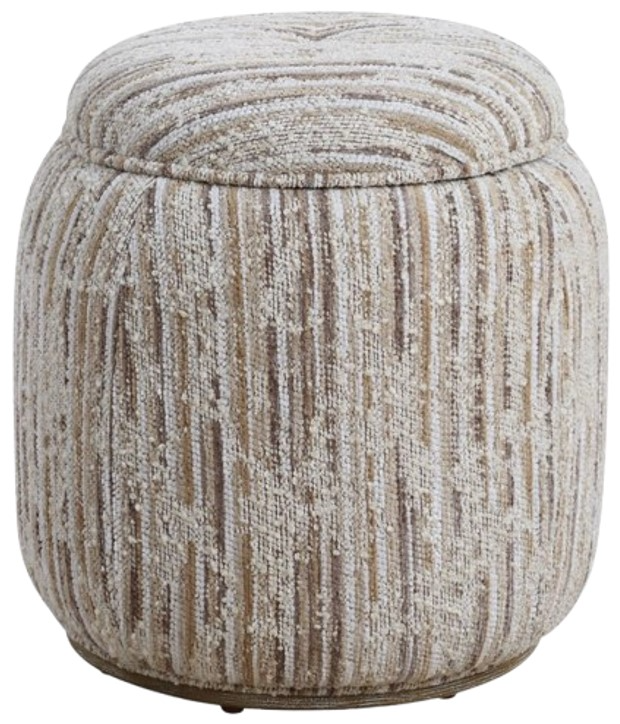 A statement stripe also acting as a neutral, the Dialogue accent stool features a slubbed boucle polyester in ivory, tan and brown tones over an oak finished solid wood base with beige ceruse. Top is removable for extra storage.Read More
