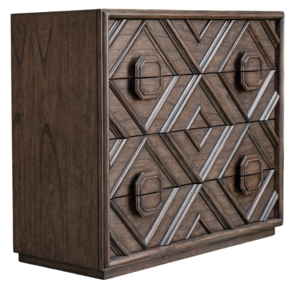 With a transitional deep walnut finish over mindi veneer, naturally distressed and hand rubbed to expose natural undertones, this four drawer chest features an updated geometric carved molding front over a floating plinth base.