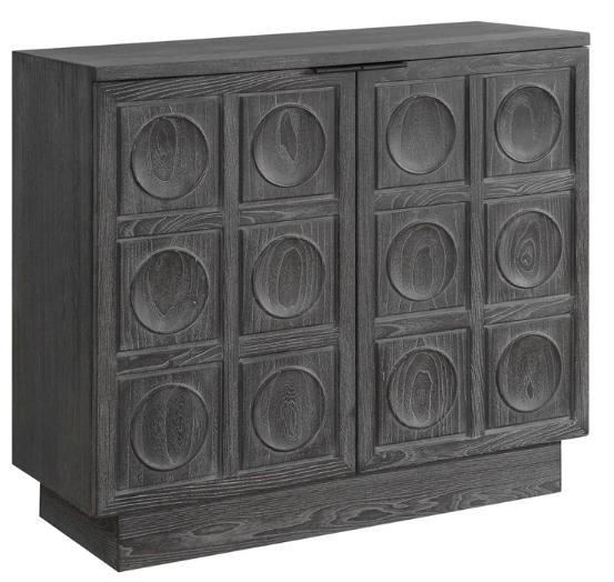 A two door cabinet featuring a striking carved circular design, constructed from solid elm and elm veneer. The rich ebony stain highlights the dramatic wood grain. Two complementing solid iron door pulls make for stylish and effortless functionality. Has one interior adjustable shelf.Read More