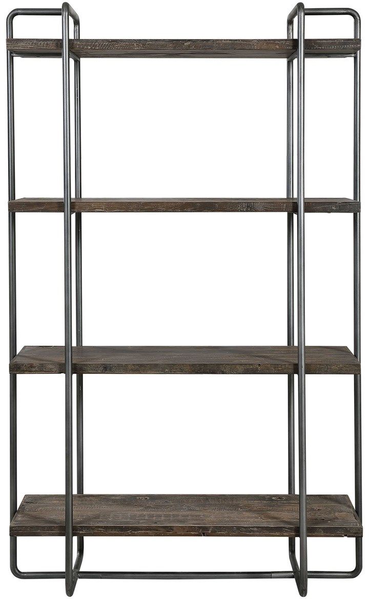 Exhibiting an urban industrial feel, this etagere features a steel frame finished in dark brushed pewter. The four floating shelves are constructed from recycled, reclaimed boat wood collected from old Chinese fishing vessels. This statement piece showcases years of use with natural wood grain texture that has subtle hints of color. Solid wood will continue to move with temperature and humidity changes, which can result in cracks and uneven surfaces, adding to its authenticity and character.Read More