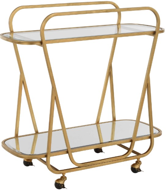 A refined serving cart, forged with a beautiful antique brass finish made completely from iron. it seamlessly combines style and utility, The two tray style beveled mirrored shelves catch natural light adding a touch of sophistication to any room.Read More